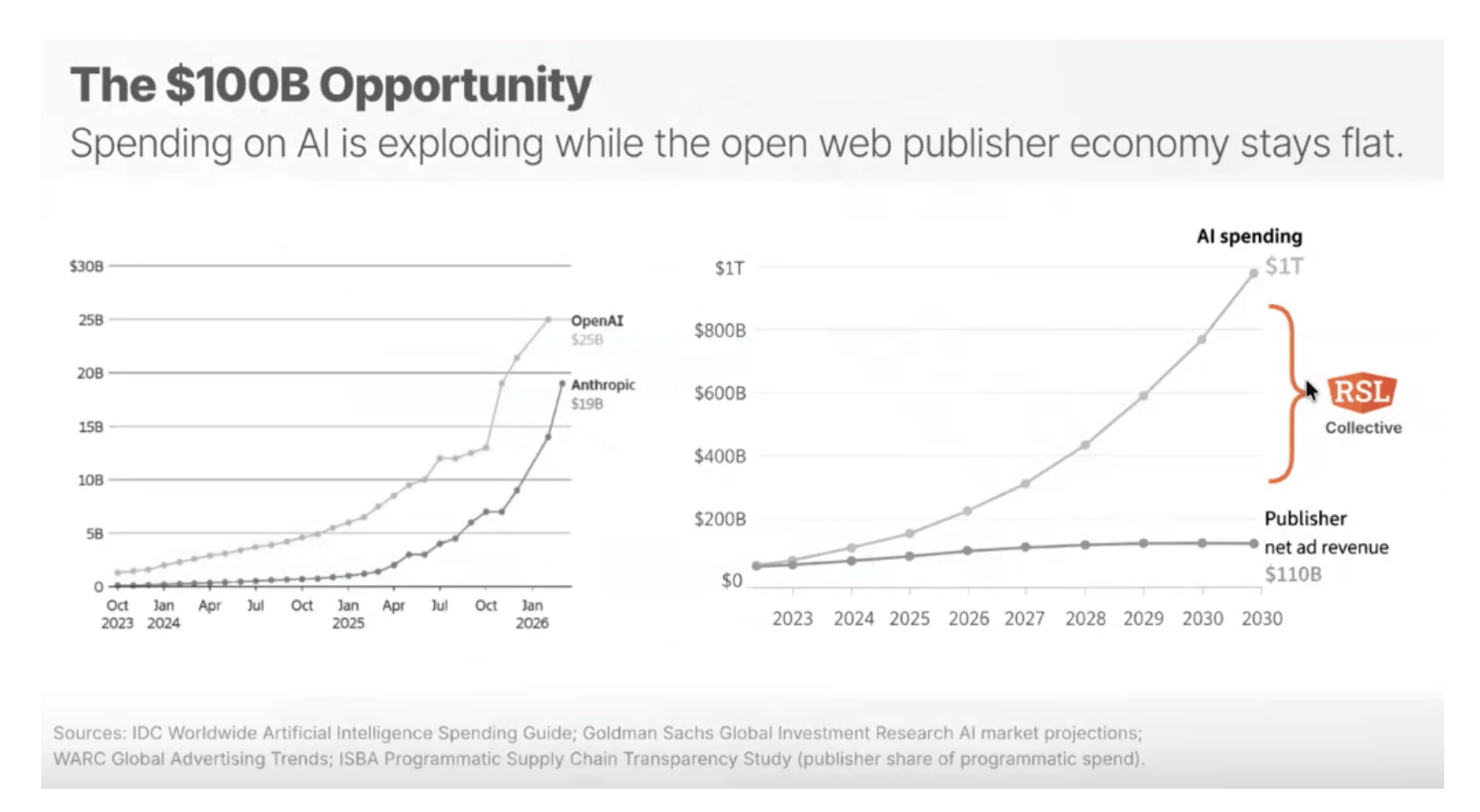 The RSL Collective puts a concrete number on what is at stake. A chart from their WAN-IFRA presentation (sources: IDC, Goldman Sachs, WARC, ISBA) shows AI spending projected to reach $1 trillion by 2030, while publisher net ad revenue stays flat at around $110 billion. OpenAI is already at a $25 billion run rate. Anthropic at $19 billion. The gap between those two curves is what RSL is trying to bridge — by capturing a percentage of AI revenue and routing it back to the publishers whose content made those models possible. John Boyden, RSL's head of partnerships, frames it simply: "Spending on AI is exploding, while the open web publisher economy has been staying flat."